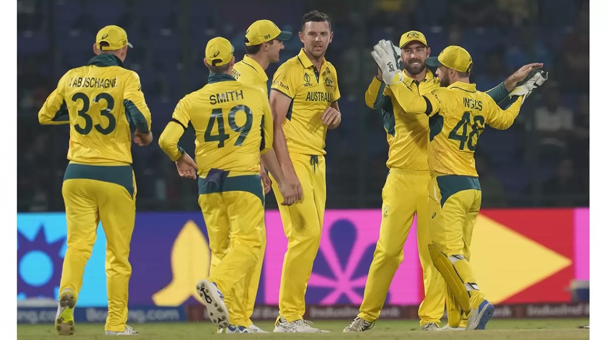 ধর্মশালার হিমাচল প্রদেশে টসে হেরে প্রথমে ব্যাট করে অস্ট্রেলিয়া। ব্যাটিংয়ে নেমে ইনিংসের শুরু থেকেই কিউই বোলারদের উপর চড়াও হয় দুই অসি ওপেনার ডেভিড ওয়ার্নার ও ট্রাভিস হেড। উদ্বোধনী জুটিতে মাত্র ১৯.১ ওভারে ১৭৫ রান করেন এই দুই ওপেনার। ৬৫ বলে ৫টি চার আর ৬টি ছয়ে ৮১ রান করে সাজঘরে ফেরেন ওয়ার্নার। সঙ্গী ওয়ার্নারকে শতকের আগে ফেরানো গেলেও ট্রাভিস হেড মাত্র ৬৭ বলে ১০টি চার আর ৭টি ছয়ে ঝড়ো ইনিংস খেলে ১০৯ রান তুলে সাজঘরে ফেরেন। দলীয় সংগ্রহ তখন মাত্র ২৩.২ ওভারে দুই উইকেটে ২০০ রান।