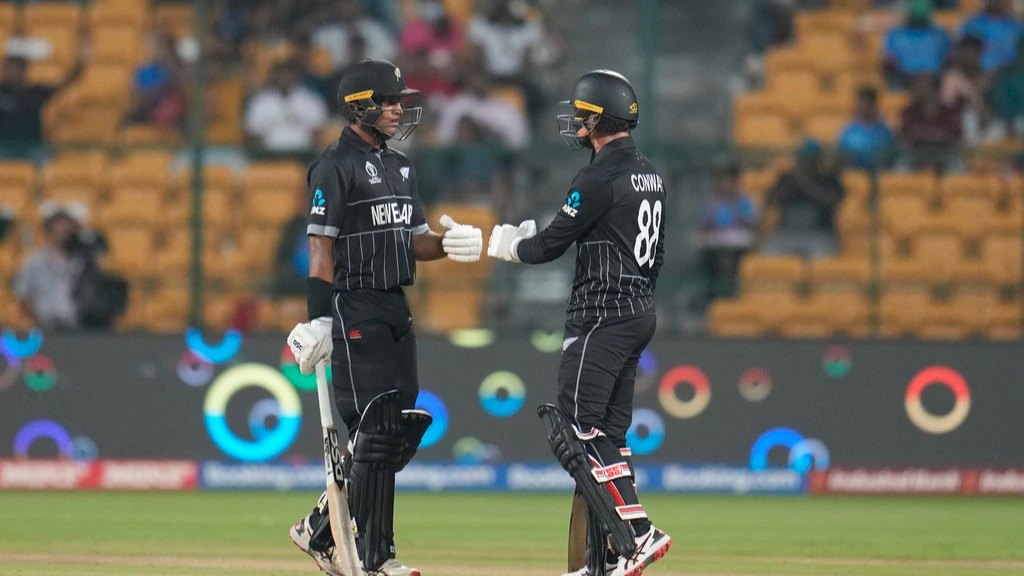 ১৭২ রানের লক্ষ্য তাড়ায় যা অঘটনের আশা ছিল শ্রীলঙ্কার, তা উড়িয়ে দেয় কিউইদের প্রথম পাওয়ারপ্লের ব্যাটিং। ব্ল্যাক ক্যাপস ওপেনাররা ধীরস্থির শুরুতে চার ওভারে ১৮ রান আনে। এরপরই দুই ওপেনারই মারমূখী ব্যাট চালান। ডেভন কনওয়ে পঞ্চম ওভারে দিলশান মাদুশাঙ্কাকে মারেন তিন চার। নিয়মিত বাউন্ডারি বের করে নিউজিল্যান্ড পঞ্চাশ রান করে ফেলে ৩৯ বলেই। স্টাইলিশ ব্যাটসমেন রাচিন রবিন্দ্রও দৃষ্টিনন্দন শটে চার-ছয় মারতে থাকেন। ৪০ ওভার বাকি থাকতেই কিউইরা তাদের প্রয়োজনটা নামিয়ে আনেন একশর কম রানে। কিন্তু তাদের চোখটা ছিল নেট রানরেটের দিকে। ব্ল্যাক ক্যাপস শিবির নড়বড়ে করে চামিরা। তার বলে আউট হয়ে কনওয়ে ফিরে যান ৯ চারের সাহায্যে ৪২ বলে ৪৫ রানের ইনিংস খেলে। ৮৬ রানে প্রথম উইকেট হারানো নিউজিল্যান্ড দুই রানের মধ্যেই হারিয়ে ফেলে আরেকটি উইকেট। রবিন্দ্র থিকশানাকে মারতে গিয়ে মিডঅনে ধরা খেয়ে যান। ৩ চার ও ৩ ছয়ে ৩৪ বলে ৪২ রানের ইনিংস খেলে সাজঘরে ফিরে যান তিনি। কেন উইলিয়ামসন এসে ১৪ রানেই বোল্ড হয়ে ফিরে যান। কিন্তু ড্যারিল মিচেল প্রথম বল থেকেই ব্যাটিং করেন নেট রানরেটের দিকে চোখ রেখে। আক্রমণাত্মক ব্যাটিংয়ে দ্রুত রান তাড়ার তাড়না ফুটে উঠে তার ব্যাটে। দুর্দান্ত সব শটেও বের করতে থাকেন বাউন্ডারি। ভুল বোঝাবুঝিতে ৭ রানে মার্ক চ্যাপম্যান রানআউট হয়ে ফিরে যান। মিচেলের ইনিংস ৩০ বলের বড় হয়নি। তবে ৩০ বলের ইনিংসেই ৫টি চার ও ২ ছয় মেরে ৪৩ রান এনে মিচেল যখন ফিরছেন তখন ব্ল্যাকক্যাপসরা ২৩তম ওভারে জয় থেকে ১০ রান দূরে। ১০ বলে ১৭ রানের ক্যামিও খেলে জয় ছিনিয়ে আনতে বেশি সময় নেননি গ্লেন ফিলিপস। যার ফলে ৫ উইকেটের বিশাল জয় পেয়ে যায় নিউজিল্যান্ড।