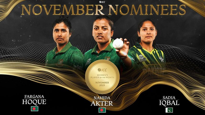 আইসিসির নভেম্বর মাসের সেরা নারী ক্রিকেটারের সংক্ষিপ্ত তালিকায় আছেন বাংলাদেশের স্পিনার নাহিদা আক্তার ও ব্যাটসম্যান ফারজানা হক। গত মাসের পারফরম্যান্সের জন্য এই তালিকায় জায়গা পেয়েছেন তারা। পাকিস্তানের সাদিয়া ইকবালের সঙ্গে তারা লড়াই করবেন। বৃহস্পতিবার মাস সেরা ক্রিকেটারদের সংক্ষিপ্ত তালিকা প্রকাশ করে আইসিসি।