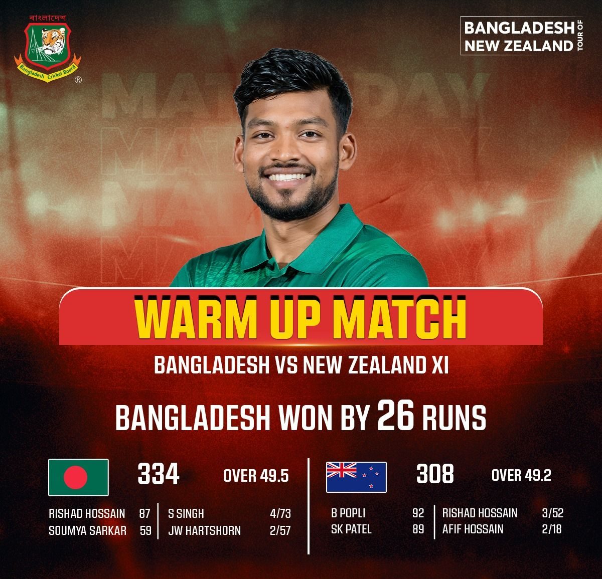 উজিল্যান্ড একাদশ। তারুণ্যনির্ভর নিউজিল্যান্ড একাদশের বিপক্ষে আগে ব্যাট করে বাংলাদেশ চারটি অর্ধশতকের ভিত্তির উপর ৪৯.৫ ওভারে ৩৩৪ রান করে অলআউট হয়। জবাবে ৩০৮ রানে শেষ হয়ে যায় নিউজিল্যান্ড একাদশের ইনংস। ২৬ রানের জয়ে নিউজিল্যান্ডের বিপক্ষে ১৭ ডিসেম্বর শুরু হতে যাওয়া ওয়ানডে সিরিজের প্রস্তুতি সারল বাংলাদেশ।
